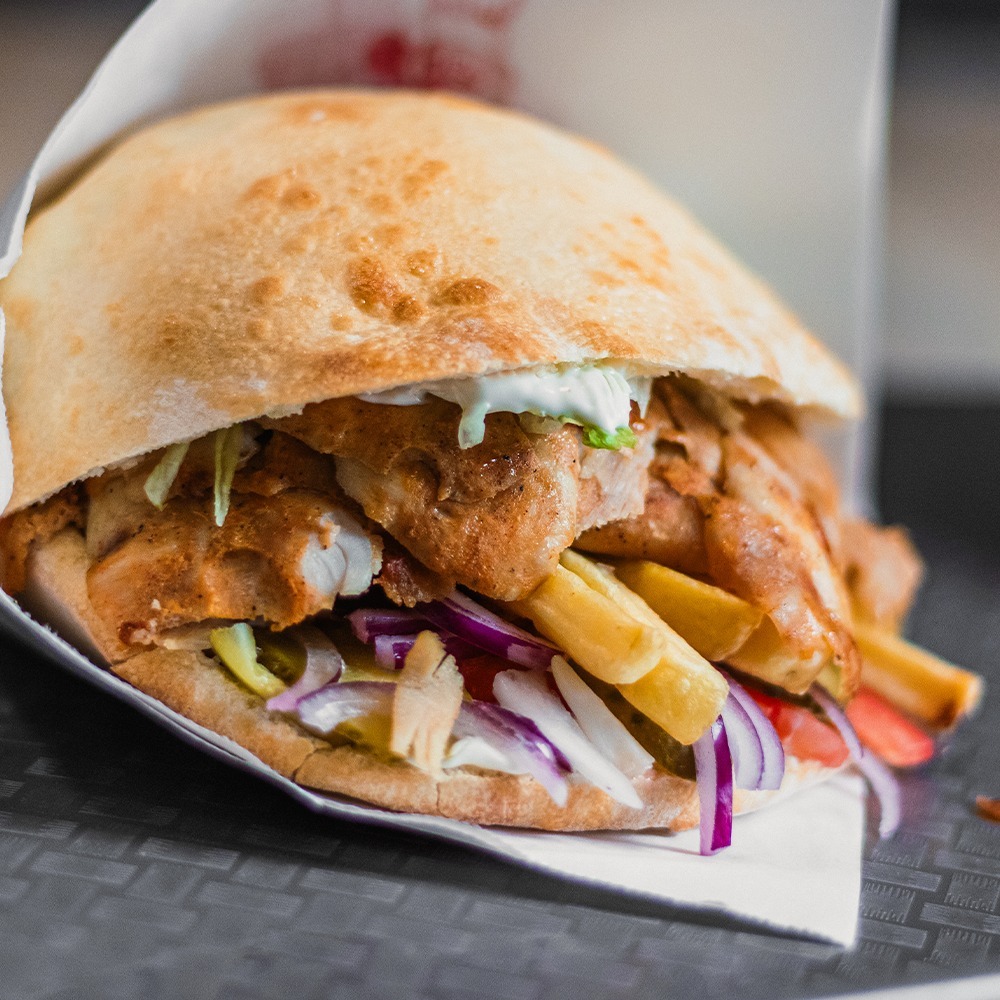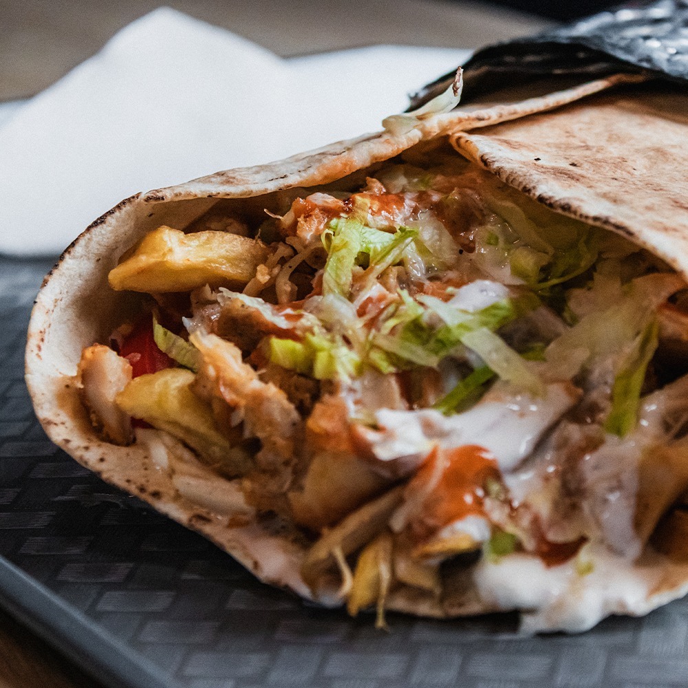 carne pui 150g, cartofi prăjiți 100g, sos la alegere 200g, lipie 70g, roșii 30g, ceapă 10g, castraveți murați 20g, salată 20g -