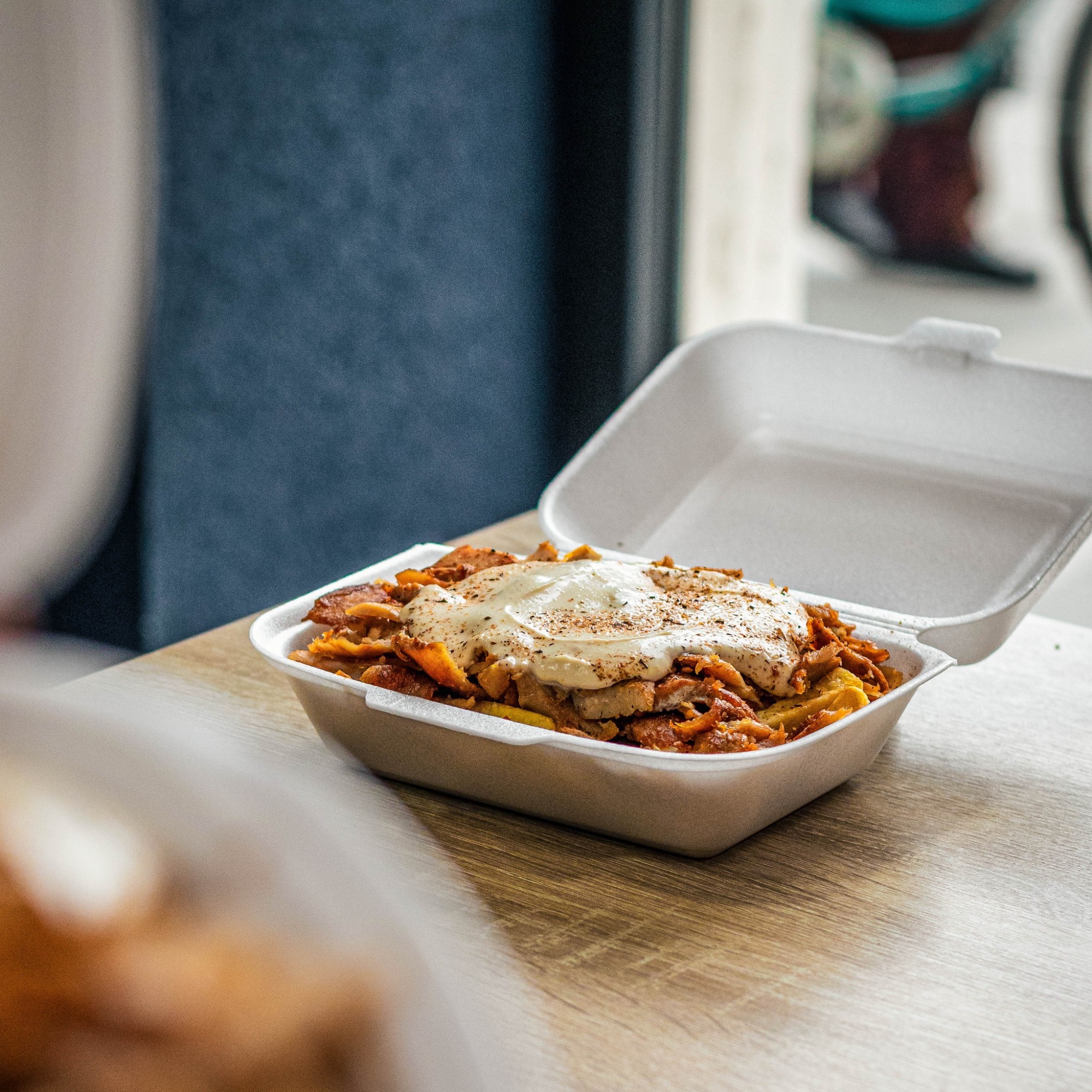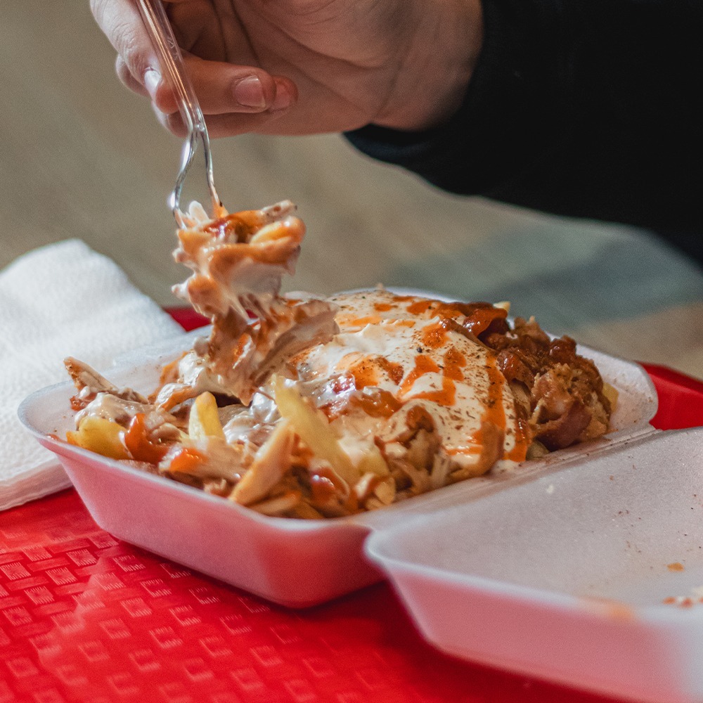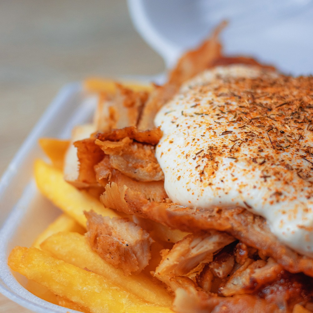carne pui 180g, cartofi prăjiți 200g, sos la alegere 160g, lipie 110g,mozzarella 100g,cheedar 150g