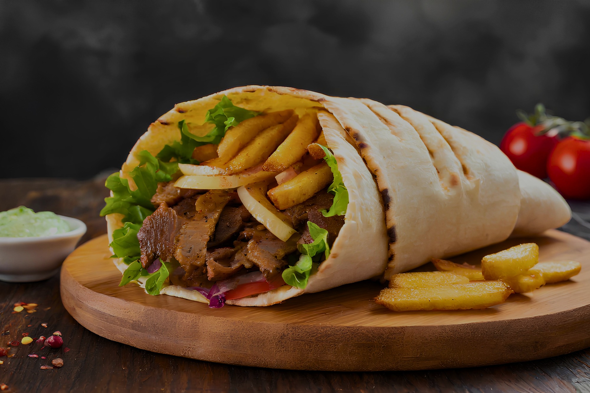carne pui 100g, cartofi prăjiți 50g, sos la alegere 140g, lipie 50g, roșii 30g, ceapă 10g, castraveți murați 20g, salată 20g -